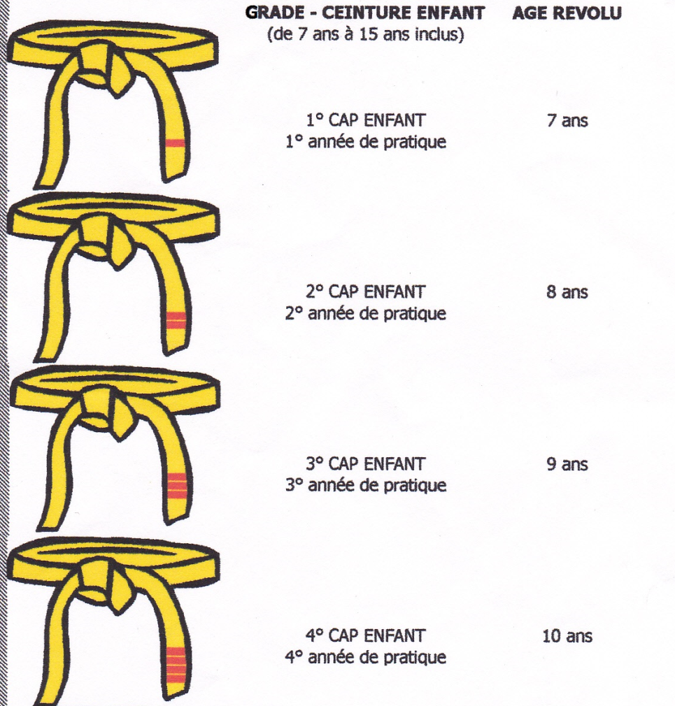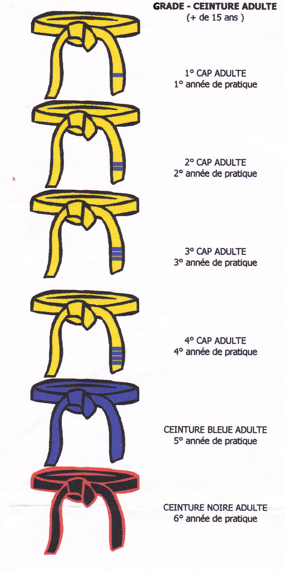 Chaque année de pratique est récompensée par une barrette. La couleur de la barrette à coudre sur les ceintures varie selon la catégorie, la couleur de la ceinture et l'âge du pratiquant :